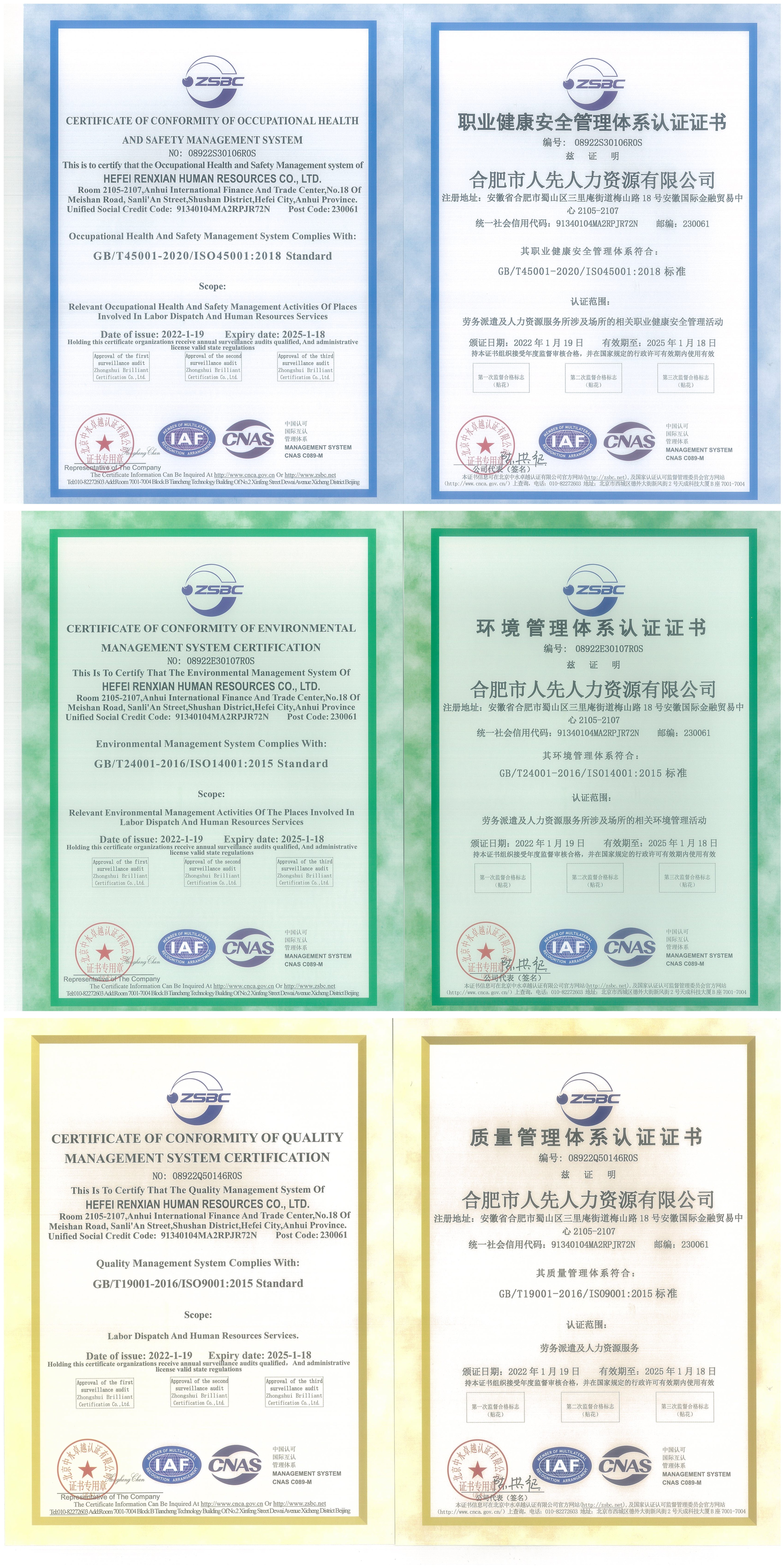 合肥人先人力資源認(rèn)證通過(guò)質(zhì)量管理、職業(yè)健康安全、環(huán)境管理三大體系